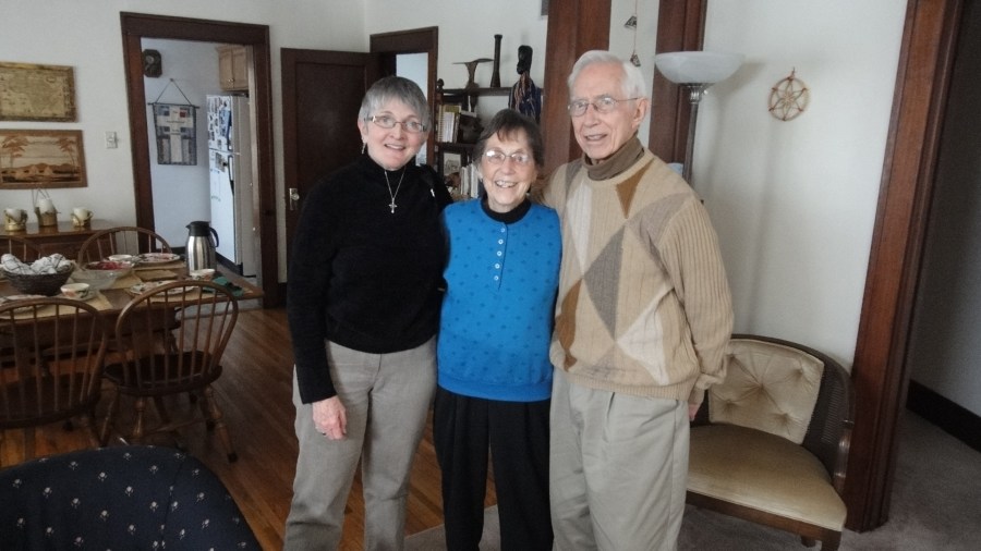Marty poses with Ruth and Lowry Mallory in their home, a year ago in January.