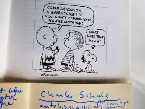 In Indy, Charles Schulz, creator of the Peanuts cartoon strip, spoke to us from his home in California via speaker phone. The cartoon Schultz created for convention attendees has Charlie telling Linus, “Communication is everything! If you don’t communicate you’re nothing.” Snoopy asks, “What does that mean?”