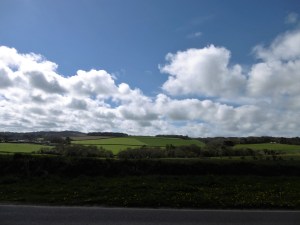 Bluebells flank the tower of St Uny  Church in Lelant. Flowers, two curious and animated donkeys, fields and sky and blooming Blackthorn keep us engaged in the out-of-doors.