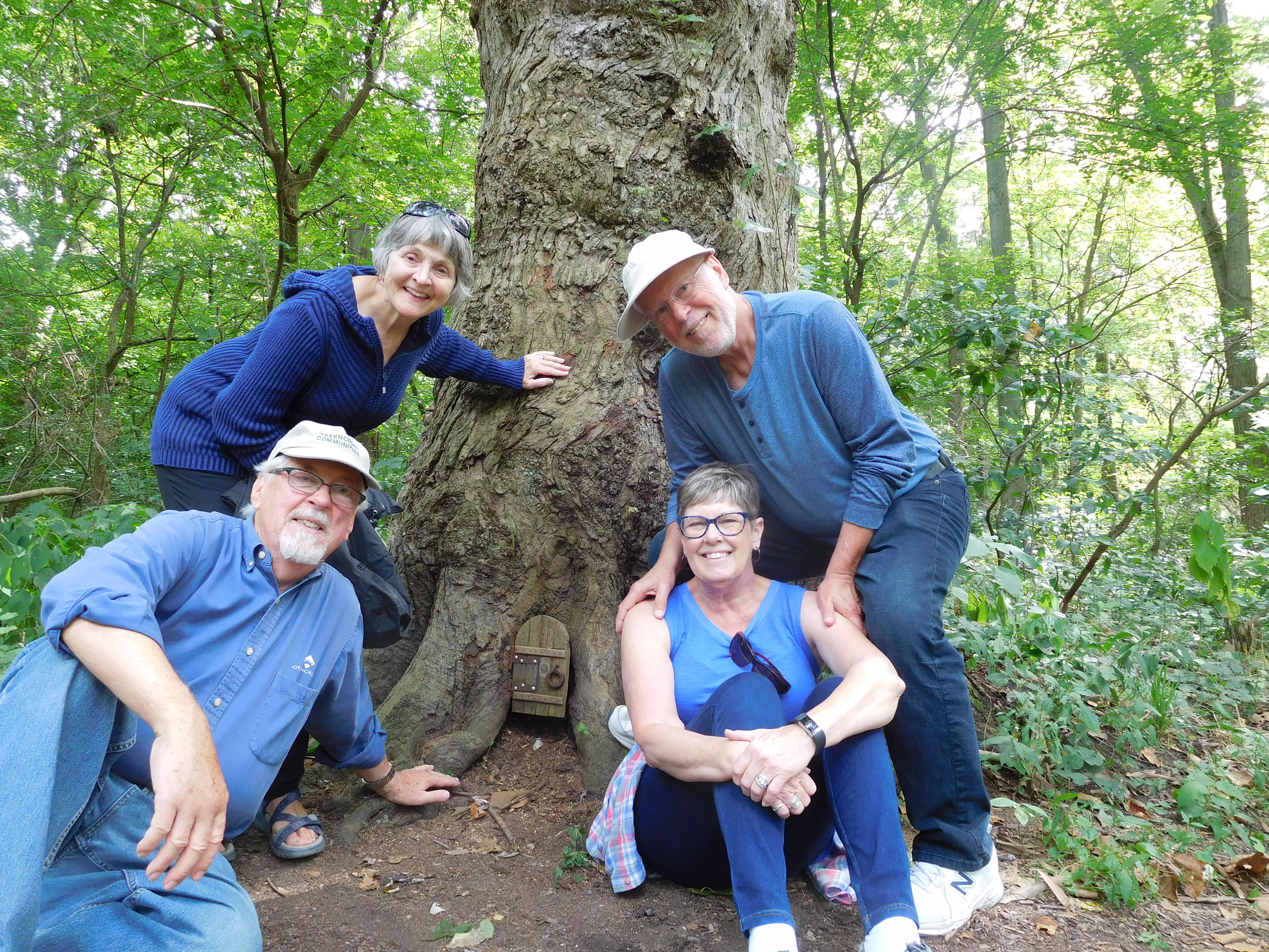 Marty, me, Monty and Ginger surround a door in a tree on a path in Oxbow Park. Maybe, next time,  the Park Fairy will have furnishings in the Fairy Garden behind a door in a tree beside a path in Oxbow Park.