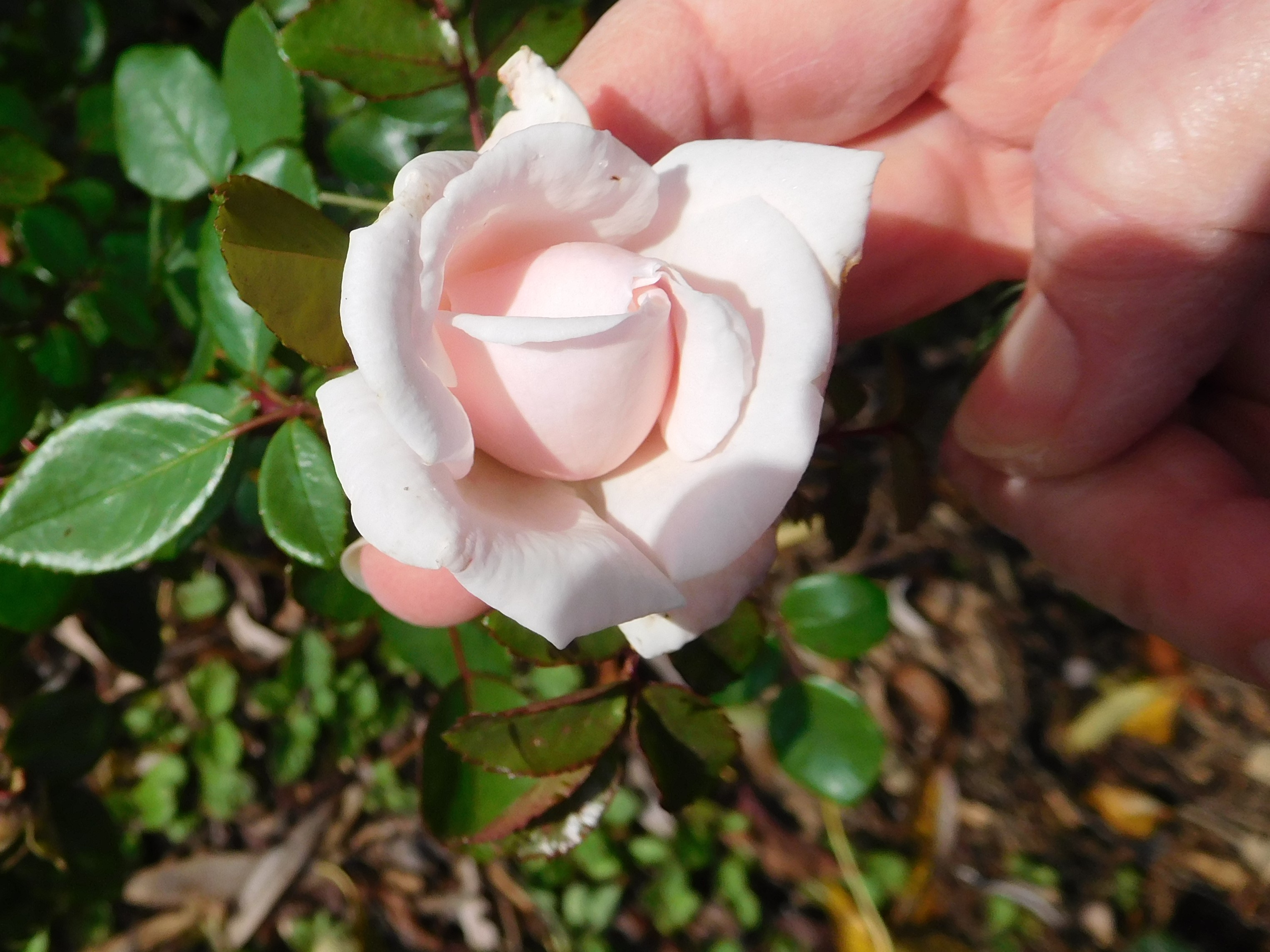 Marty holds up a rose along the River Walk on our walk on Monday. Hold on to beauty.