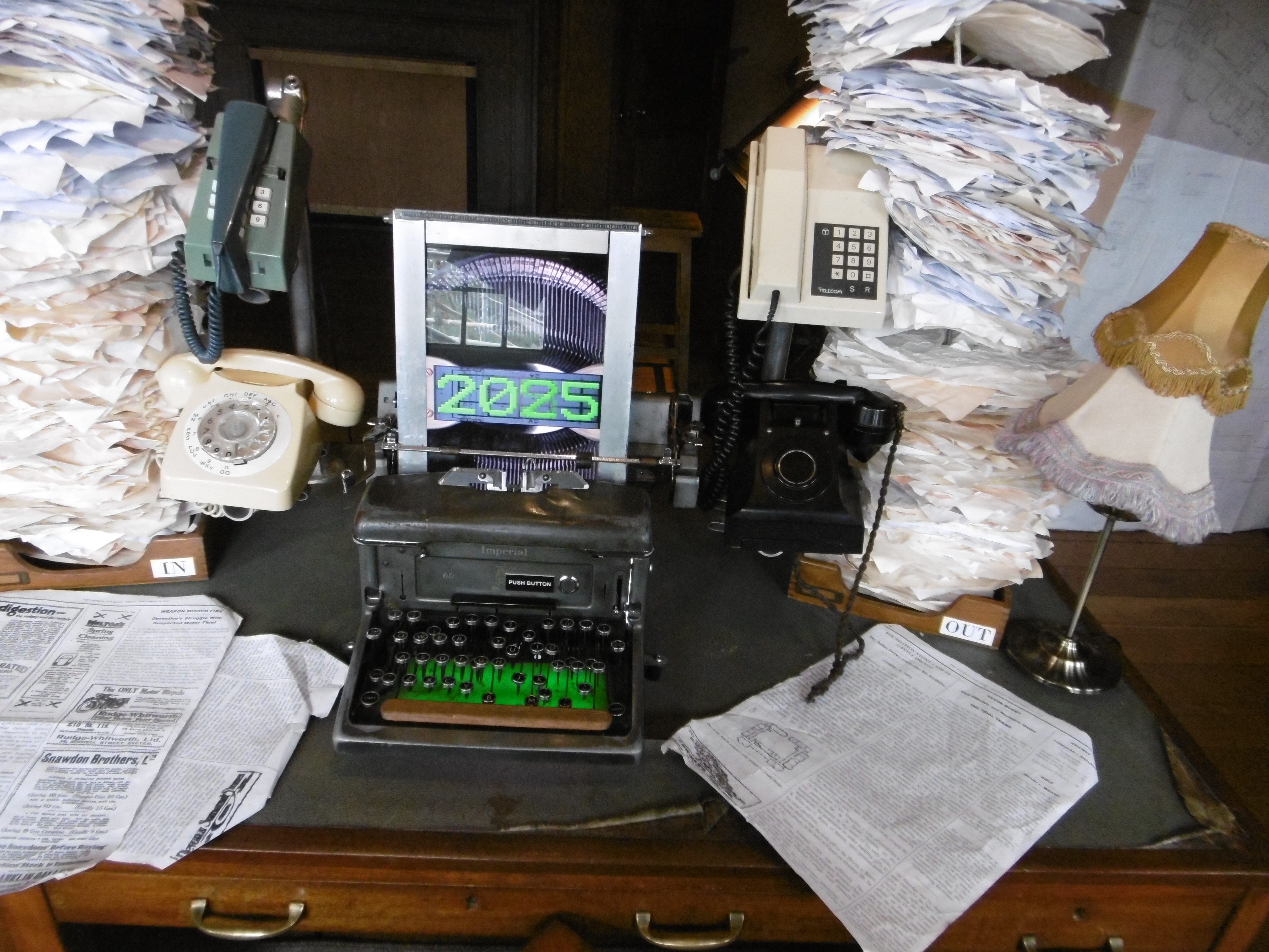 Julius Drewe drew on the latest technology in overseeing the building of his country home and castle. The stack of papers represent letters, memos, and invoices.