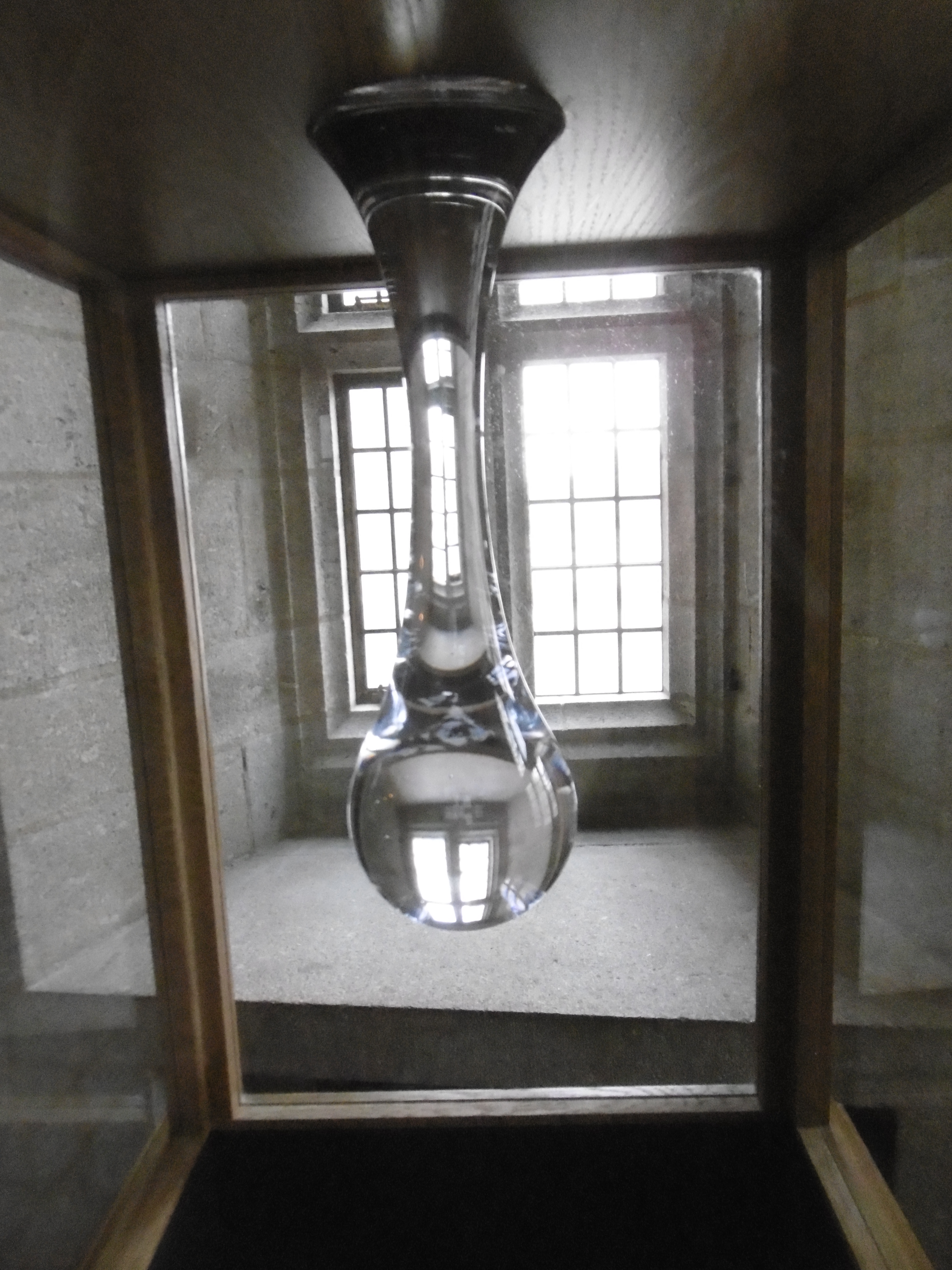 A glass pendant represents the drip, drip, drip from a leaky roof ever since Castle Drogo opened in 1930. The leak is finally to be fixed with new materials by the end of 2018. The complex generates all its own electricity from the Teign River.