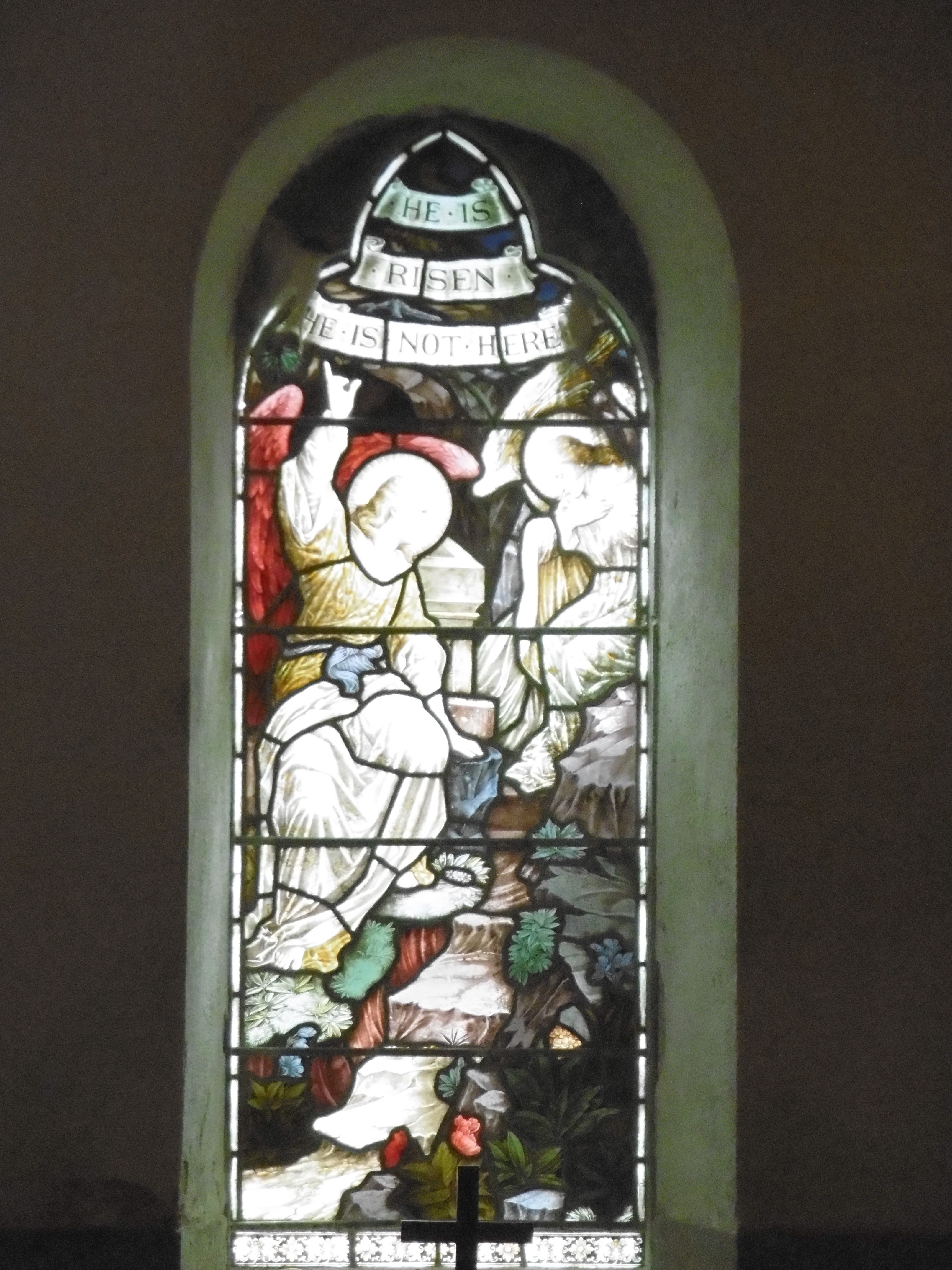 One of three stained glass windows in the family chapel. This one depicts the scene of the angel at the Garden Tomb, where Jesus spent three days, announcing, “HE IS RISEN. HE IS NOT HERE.”
