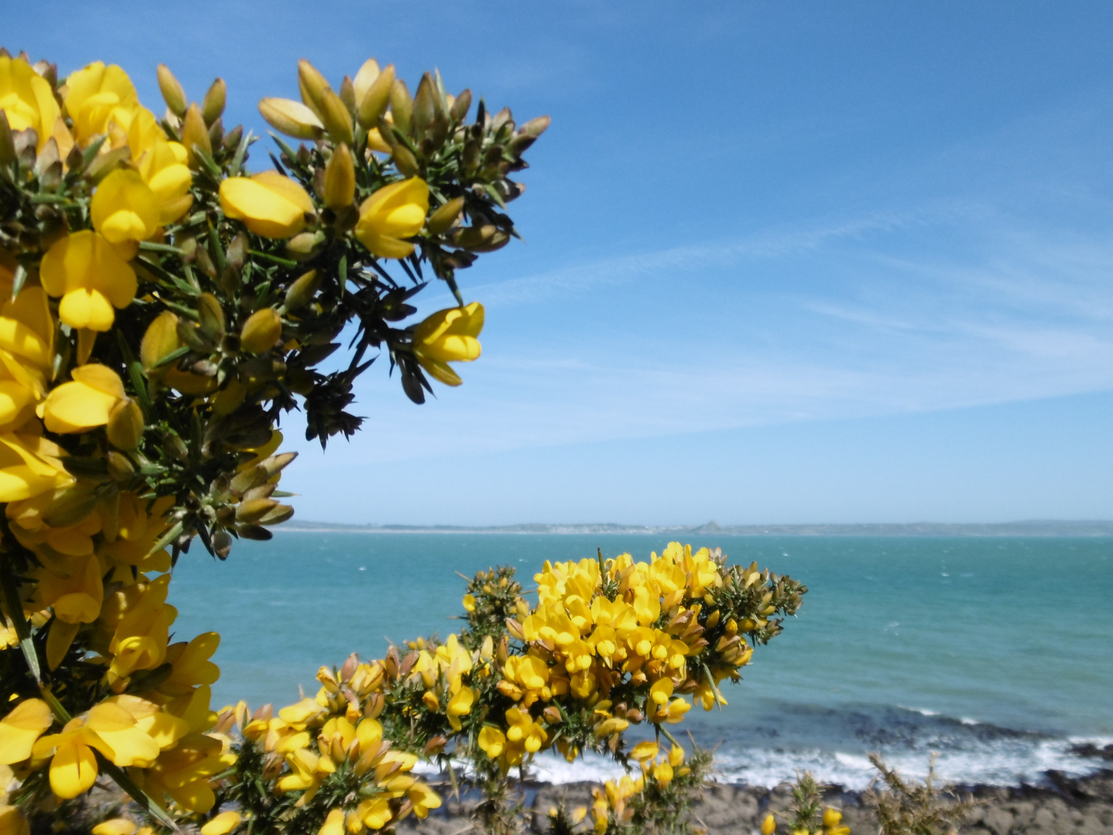 View through gorse across Mount’s Bay on a walk from Penzance to Mousehole (Mowzel) and back. Fine crab sandwich.