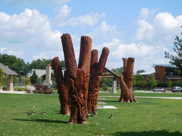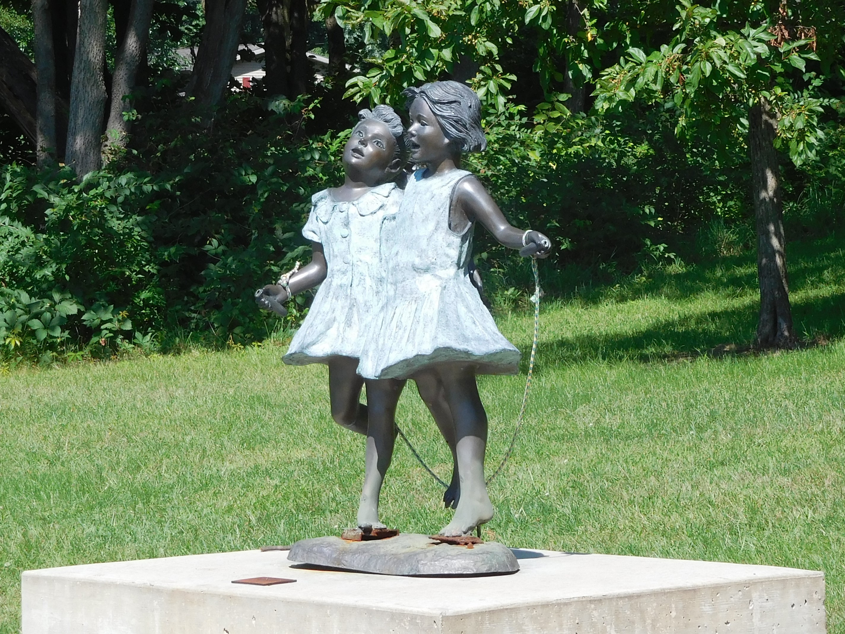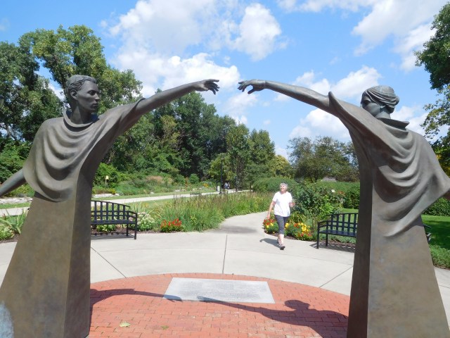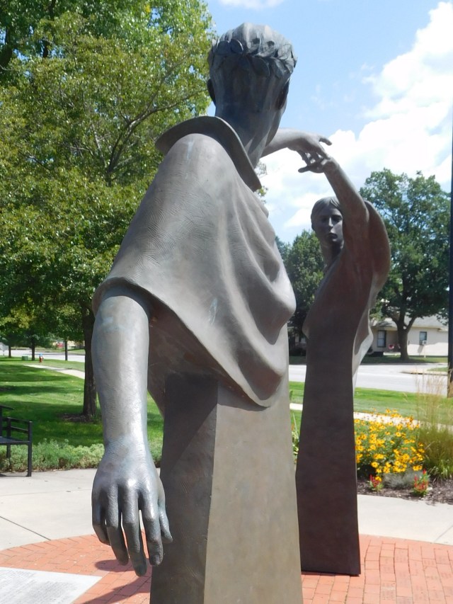 The plaque reads in part reads, a tribute “to the teachers, mentors, parents and other educators who have had a positive influence on our lives and our community. The figures, a teacher reaching out to a student form an arch suggesting education is a gateway to new skills, new ideas and new stages of life.” Sculptor is Tuck Langland; installed in 2010.