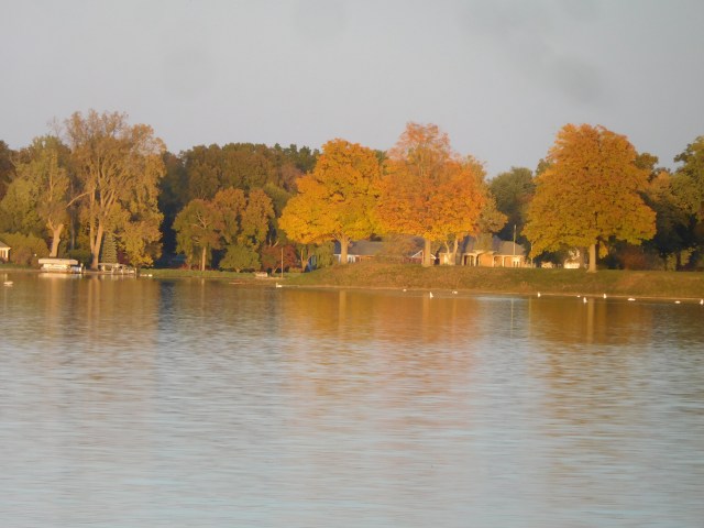 Seasonal colors, and swans, on show up river