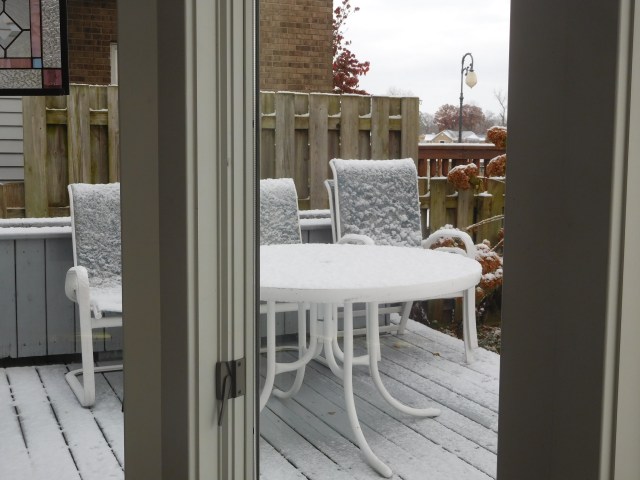 Cogitation 36 Saturday 17 November 2018   I give thanks for a bit of snow on the deck, a gray sky, a bold-brew cup of coffee, sturdy walking boots, tomorrow when Marty is worship leader, anticipation of the Bender family gathering coming up, and more and ever more.