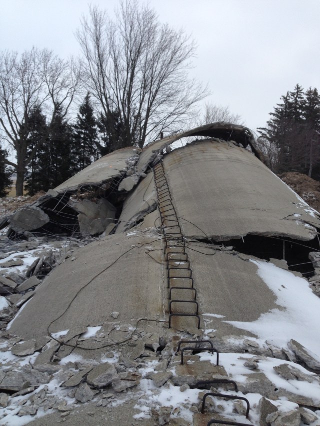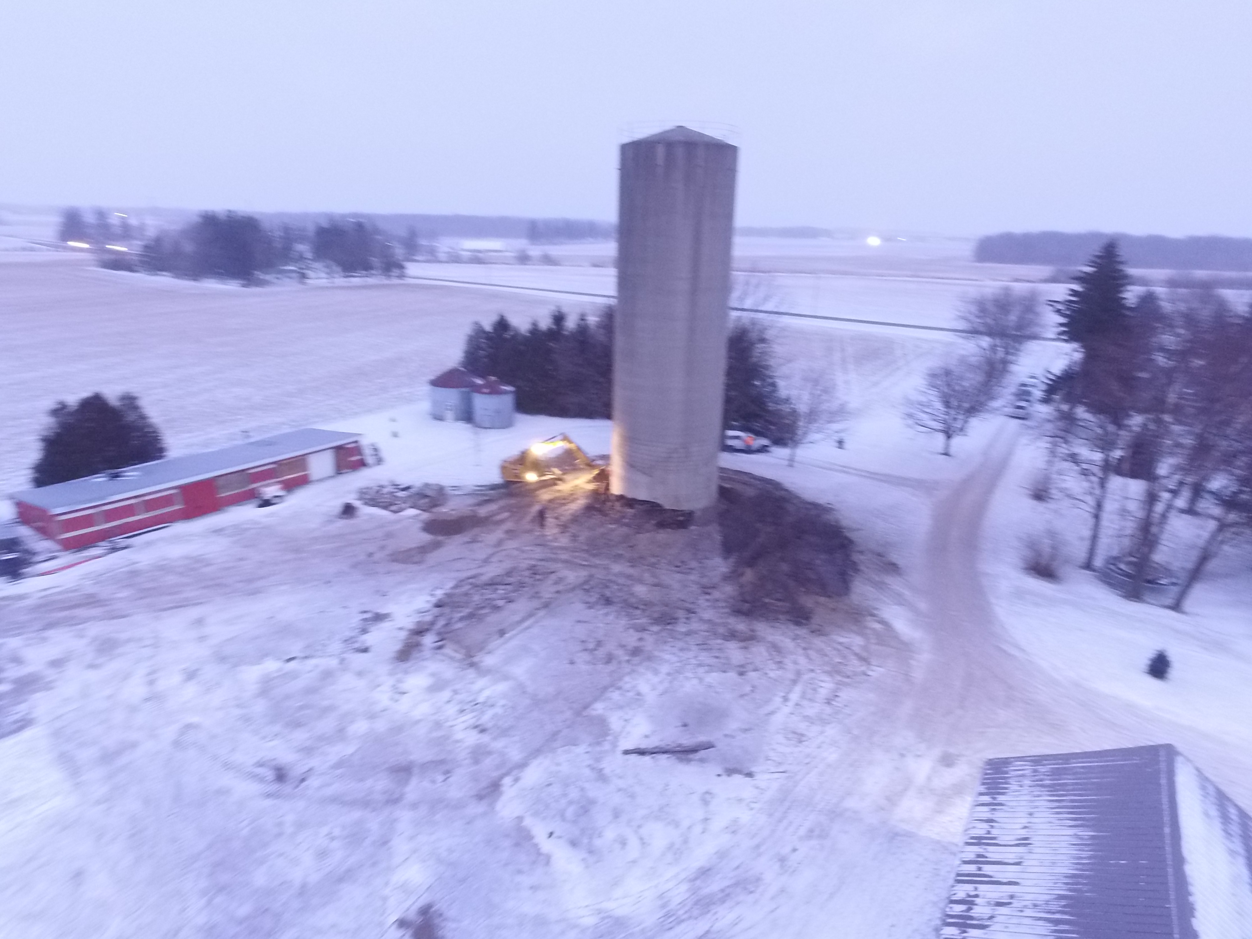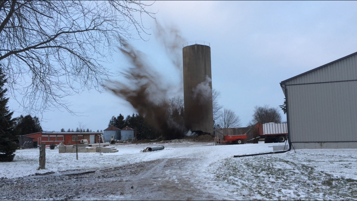 The last silo on the farm no longer stands. It took 200 sticks of dynamite to bring it down. Two other smaller silos were taken down earlier. The barn came down last summer.