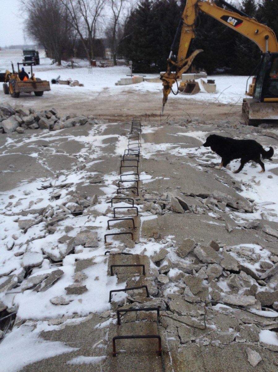 Featured image: Farm dog Milt examines the felled silo on the farm where I grew up.