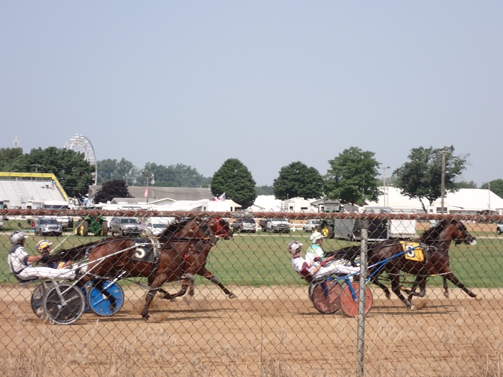 The pictures give the “tip of the iceberg,” as the saying goes. We just happened upon the harness racing when we arrived, then spent a few hours roaming about, visiting displays in the Home and Family Arts building, walking through some of the animal barns, avoiding crowded places, bearing the heat, having lunch in the shade, missing a good deal.