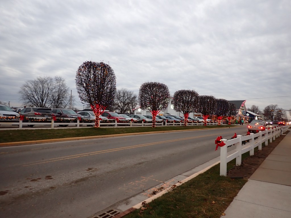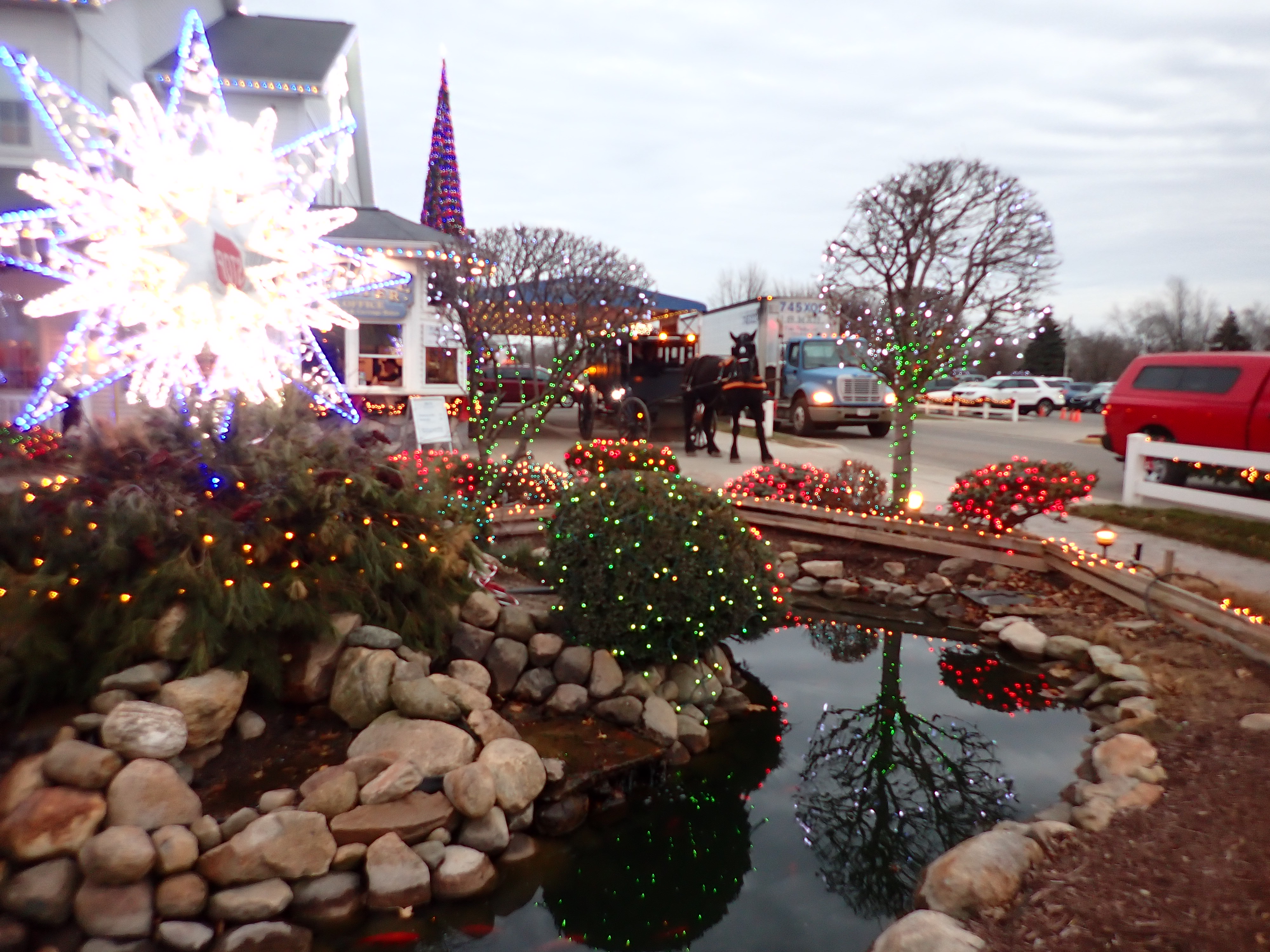 Presently, we arrive at the main four-way stop in Shipshewana. Clear and colored lights shine on all sides of the streets, outlining buildings, shrubs and trees and a host of displays. Music fills the air. We pause briefly at a spotlighted nativity creche.