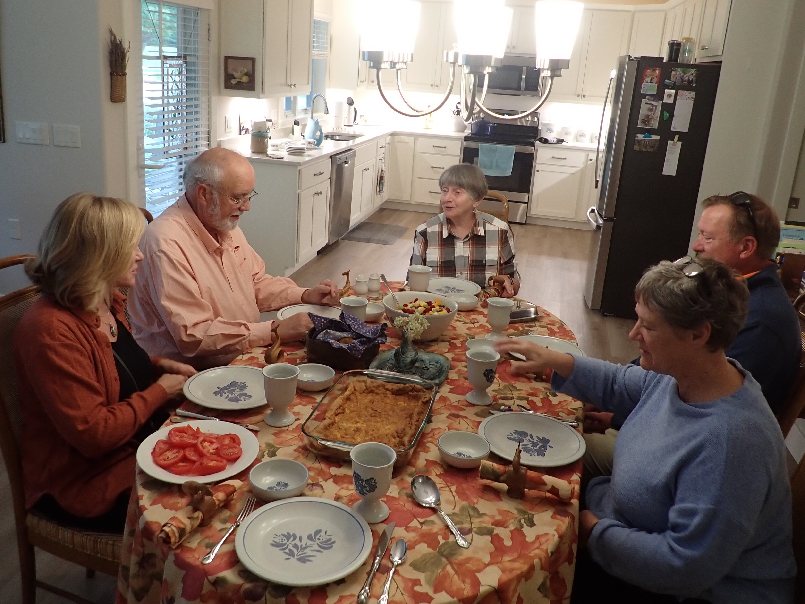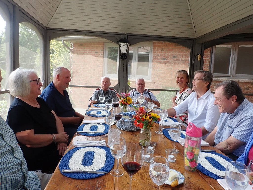 It’s a truly tasty Pasty in Michigan’s Upper Penninsula where Cornish miners emigrated when the mines in Cornwall closed. The only thing missing is the rutabaga, either because it wasn’t readily available, or customers are that keen on it. I missed it, though the crust and other contents of beef, potato and carrot proved right on to Cornish standards. Jan and John Schwartz hosted a family gathering in honor of Marty’s birthday. Pictured are Lynnette and Sandy and Marty. It was a super celebration, including sloppy joes, cake and homemade ice cream. Smiles and cheers all around. Niece Amy, next to her husband, Alan, her mother Vivian and sister Rachel, pose for a photo after Amy’s team won a qualifying race in the Stratford Rotary Dragon Boat Festival. Their Breast Cancer Survivor’s Team went on to take first place in their division. Bravo, Amy, team, family, friends!Amy’s team in qualifications. Amy is fifth from the stern. Surprise! John’s siblings and friends gathered for a birthday party at the home of Mark and Christa. We enjoyed a guest chef’s fixings of food and were surprised when cousins and friends showed up later in the afternoon. Truly surprised. Sister Kaye and brother Mark collaborated to invite 80 people to the afternoon party, while the rest guarded the secret. Almost 50 people were able to come. We should party more often. Thank you all! Cousin Ann, on the left, her husband David to the left of Marty, cousin Elizabeth, her husband Jim, to the right of Marty. We enjoyed a breakfast of tasty food and rich sharing, reaching almost to noon. The couples were in town for a high school reunion, which included a gathering to pay tribute to teachers whose influence endures. Even though the breakfast did not include all of these ingredients, I used this favorite grace: “For bacon, eggs and buttered toast, praise Father, Son and Holy Ghost. Amen.”