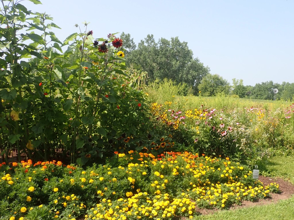 At the front, an annual garden, part of the Native Grasses and Wildflowers field at Greencroft Goshen Continuing Care Retirement Community.