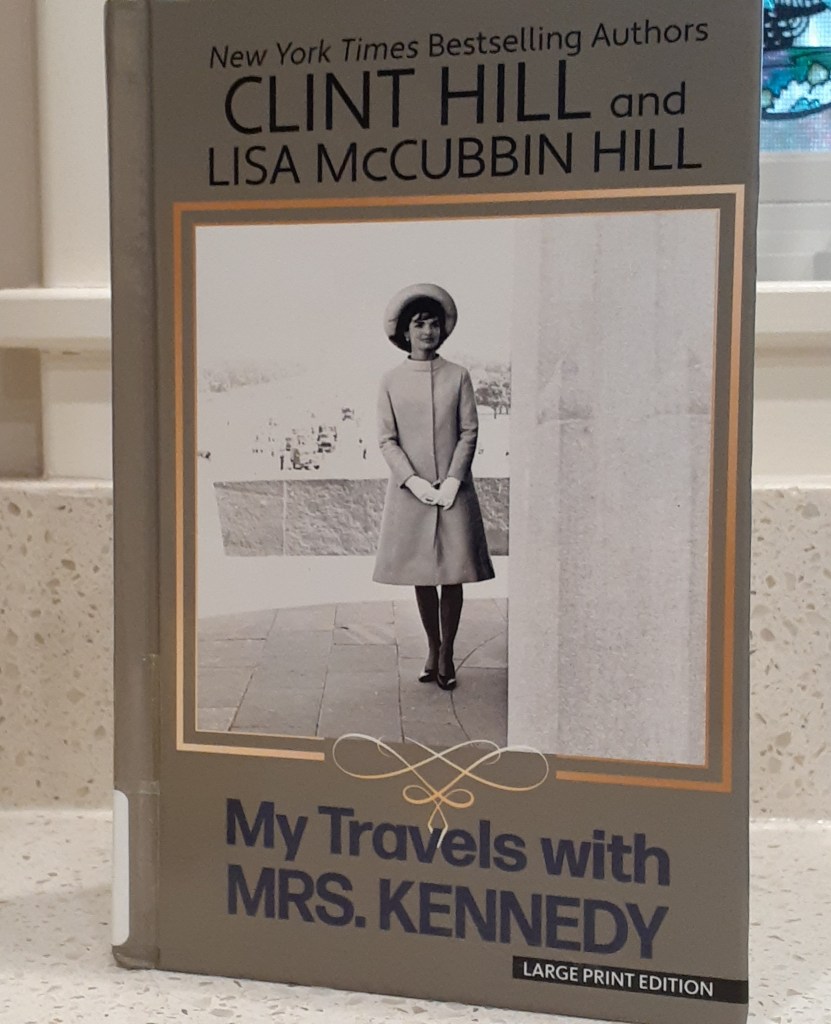 Post 40/2023. It was the last copy on the recent large print books shelves: My Travels with Mrs. Kennedy, by Clint Hill and Lisa McCubbin Hill (Gale/Thorndike Press, 2022). Hill was Mrs. Kennedy’s secret service agent. The material–written records and photos–was uncovered after 50 years from a trunk in Hill’s garage.