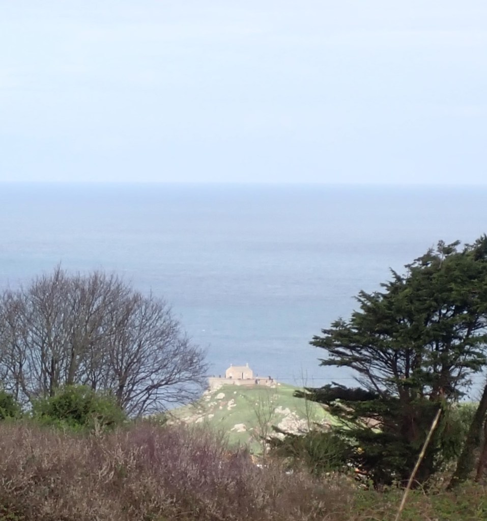 Monday. We took a longer walk to the St Ives Library and lunch. No rain until later in the day. In third photo the sun highlights St Nicholas Chapel on the Island at St Ives.