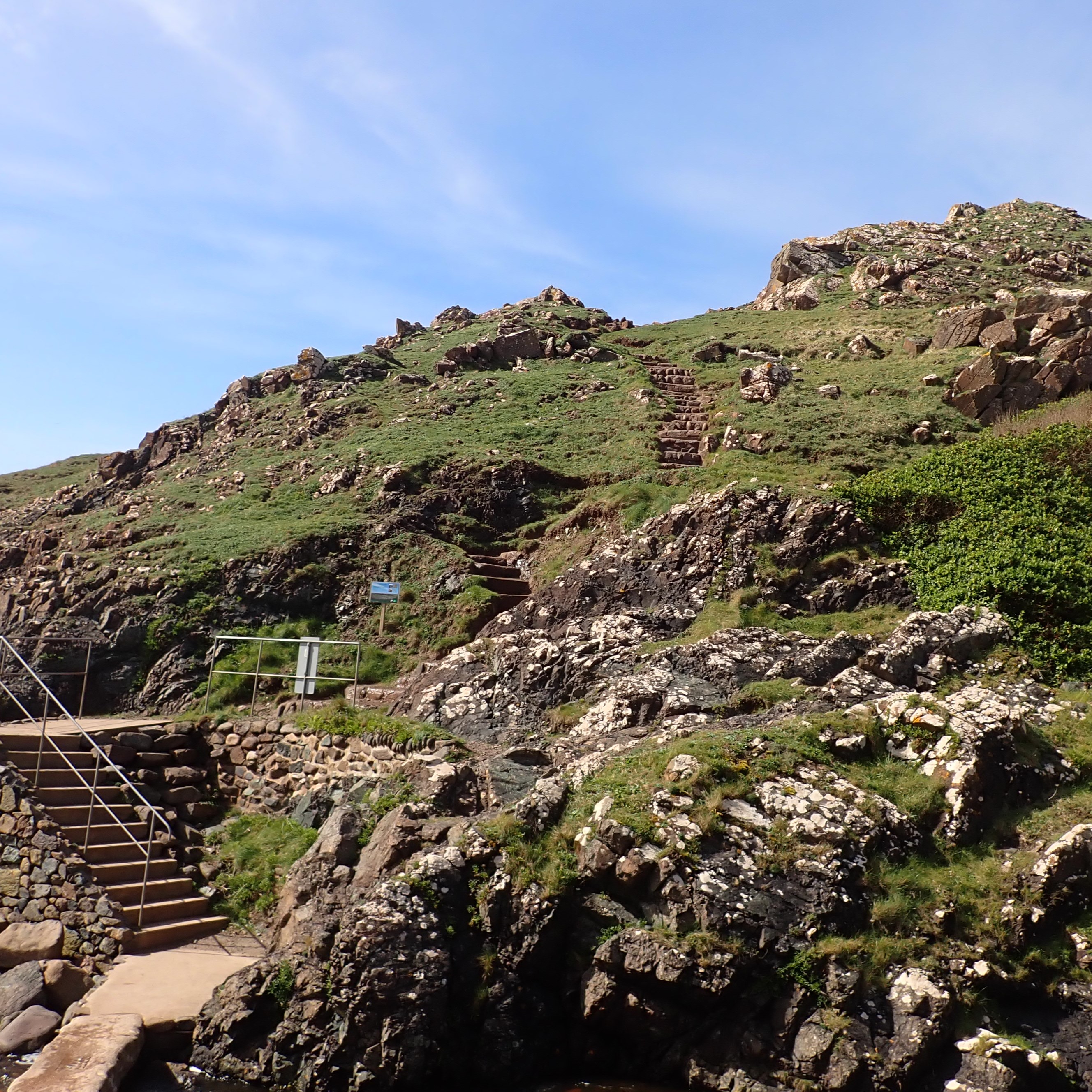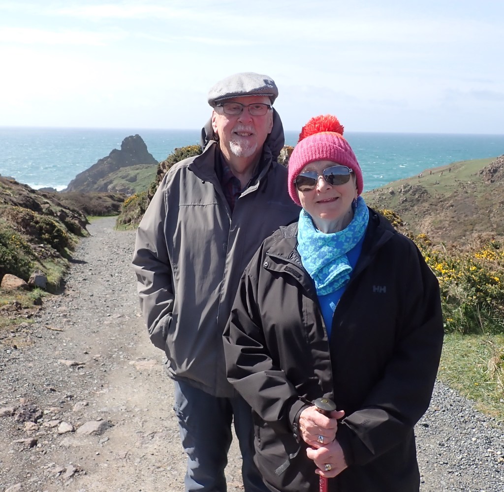 Wednesday. A trip with Steve and Marilyn to two National Trust sites on the English Channel capitalized on a sunny day. We started at Kynance Cove on The Lizard, the most visited National Trust property in Cornwall. We first walked through there on the South West Coast Path 18 years ago–more sure-footed and google-eyed. We did not climb to the top of the cliff this time.