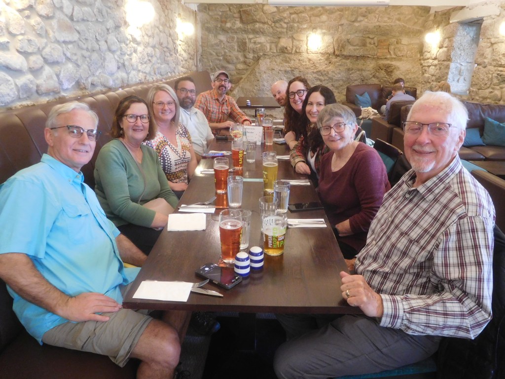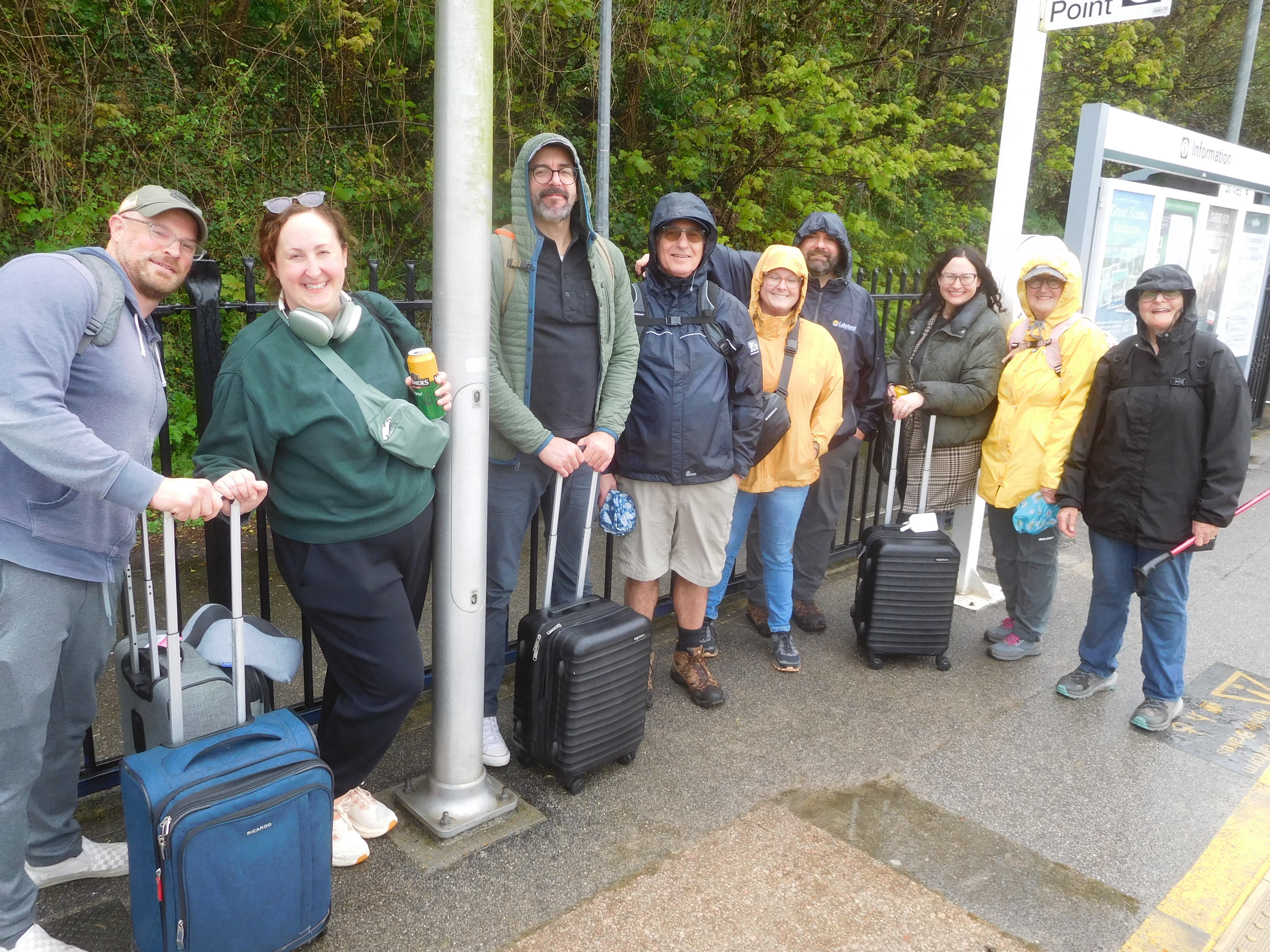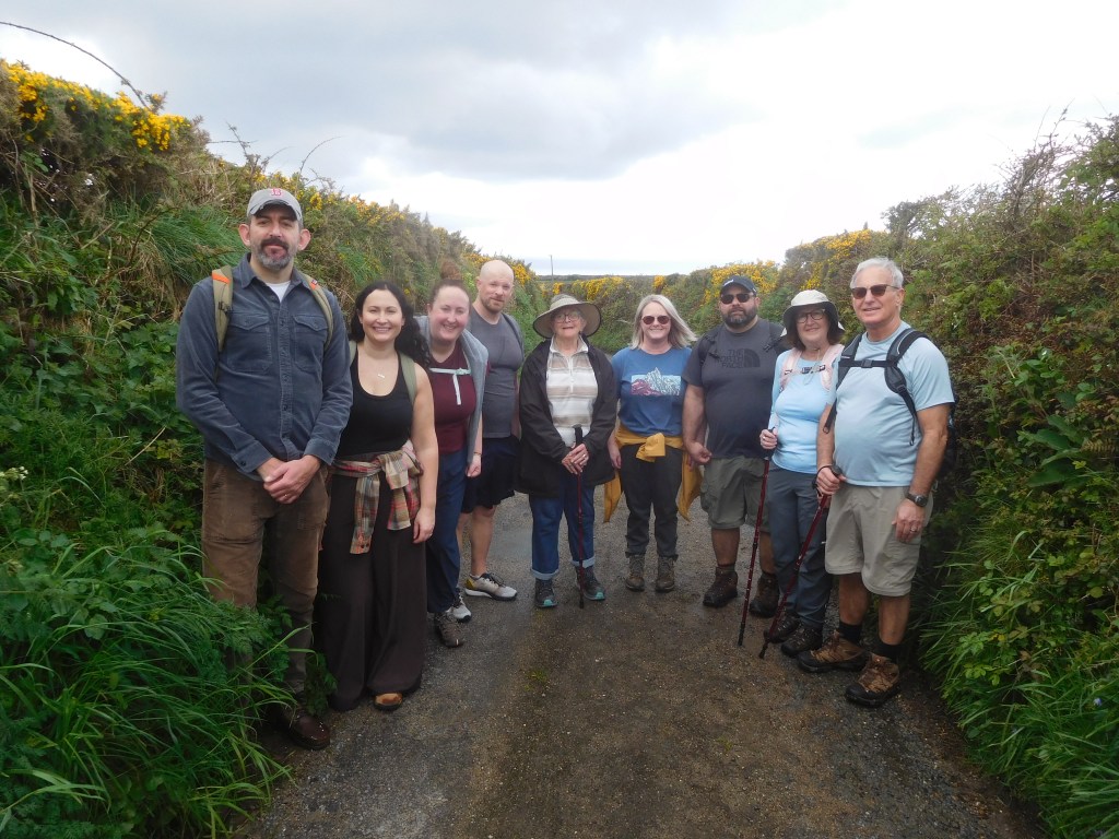 Mike, Jessie, Rory, John, Erin, Adam, Jessie, Marty, smiling in the rain. Auspicious and wonderful start to connecting in Cornwall.