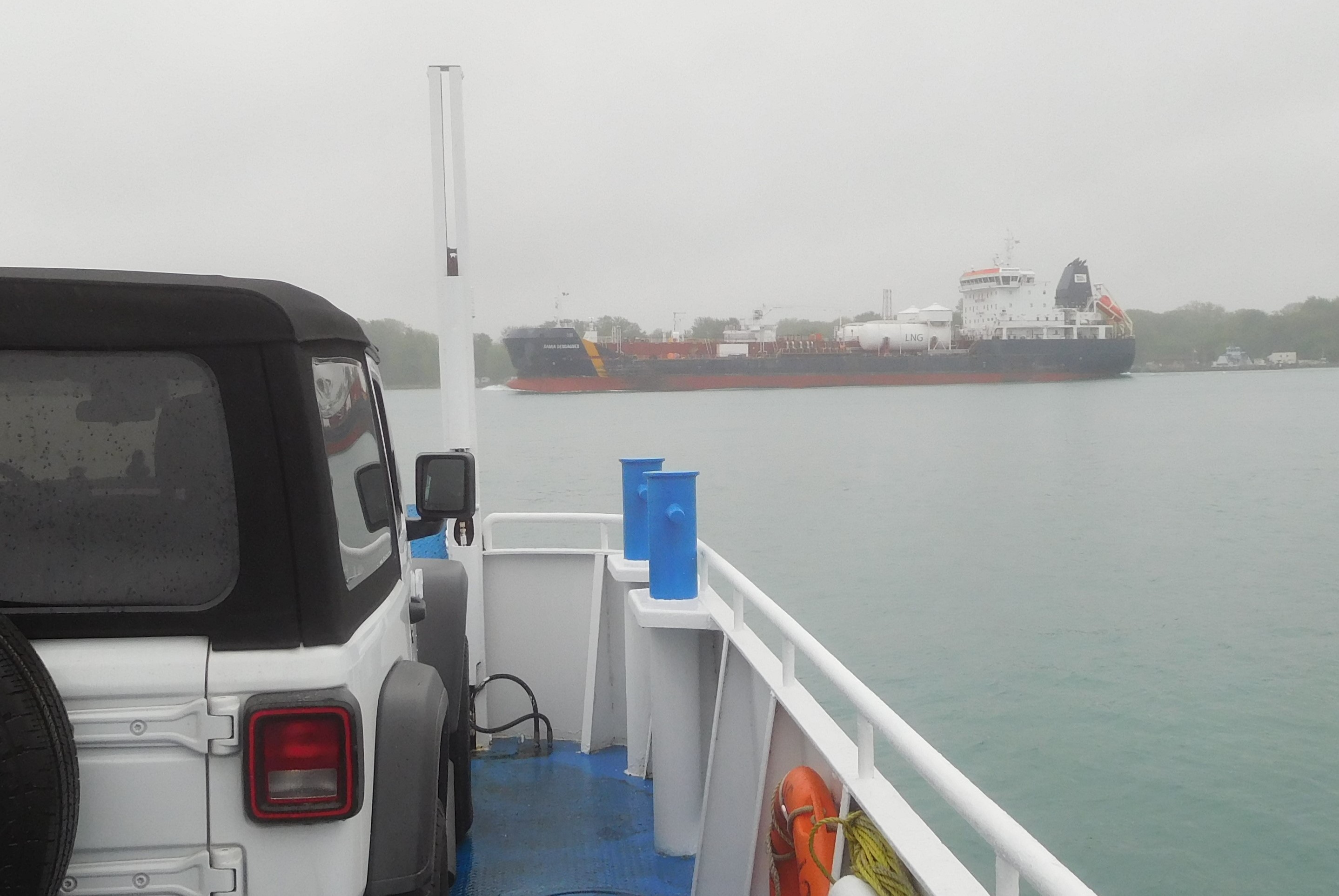 Another split-second decision: let’s head to the Ambassador Bridge in Detroit. Minutes later I modified that to crossing the St. Clair River on the Walpole Algonac Ferry. That was closer, less traffic, a plan. The 10 to 15 minute crossing is to the First Nation reserve of Walpole Island. From there we could whisk cross-country to Stratford–adding miles of course, but next to no traffic on backroads rich with rural scenes, giving us a timely check-in at our B&B.