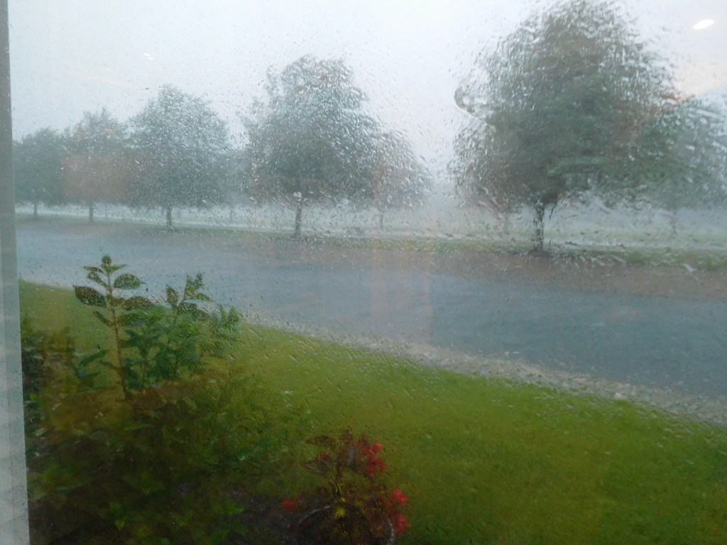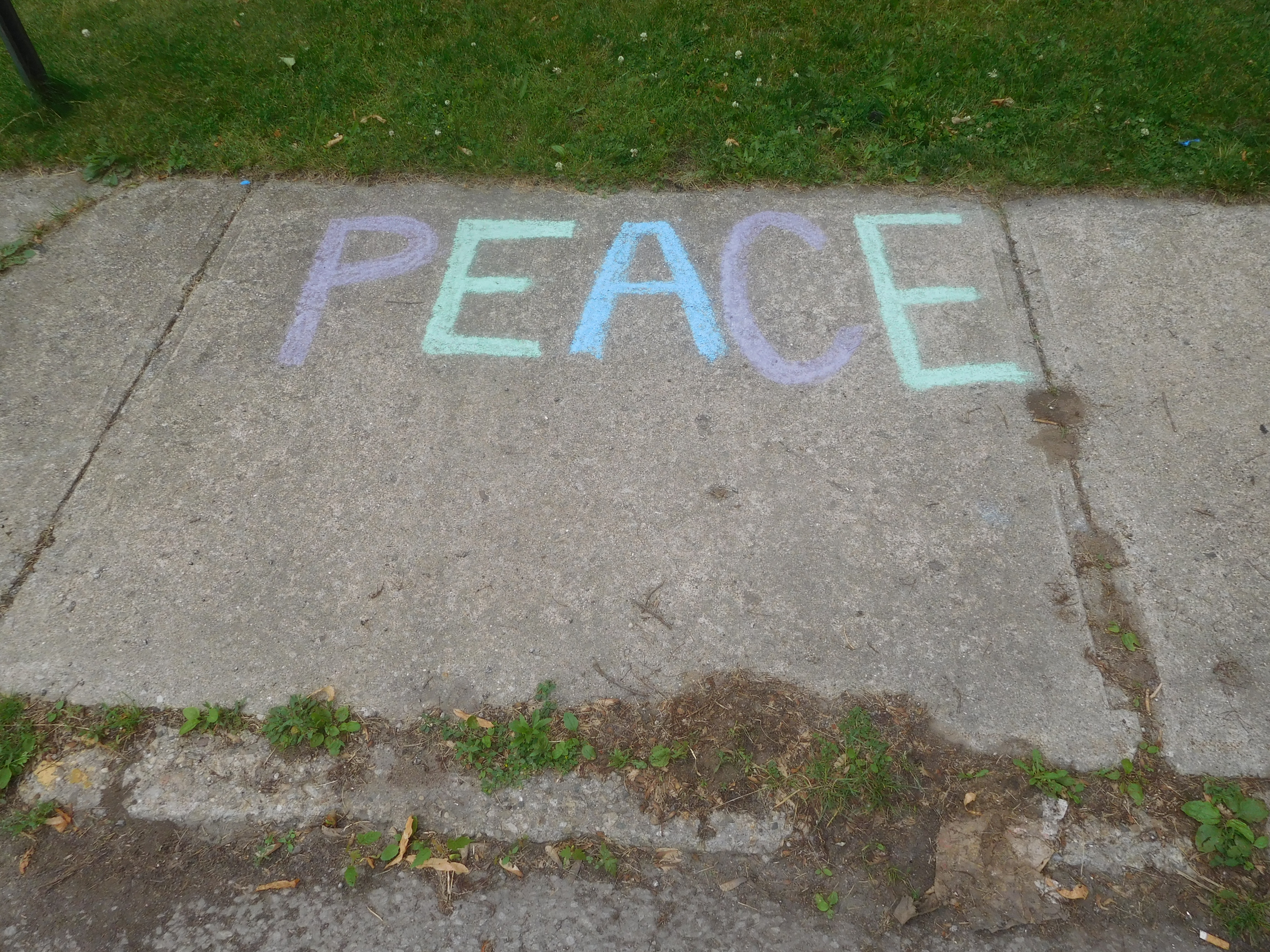 The photos are scenes from some of our walks (notably early morning from the Goshen Dam), sidewalk message on the way to the library, a newly paved walkway on the Greencroft campus, resident gardens, a heron strolling by, a downpour with high winds, the cover of the first musical of the season at Wagon Wheel Centre for the Arts–followed by a brief comment on puzzles.