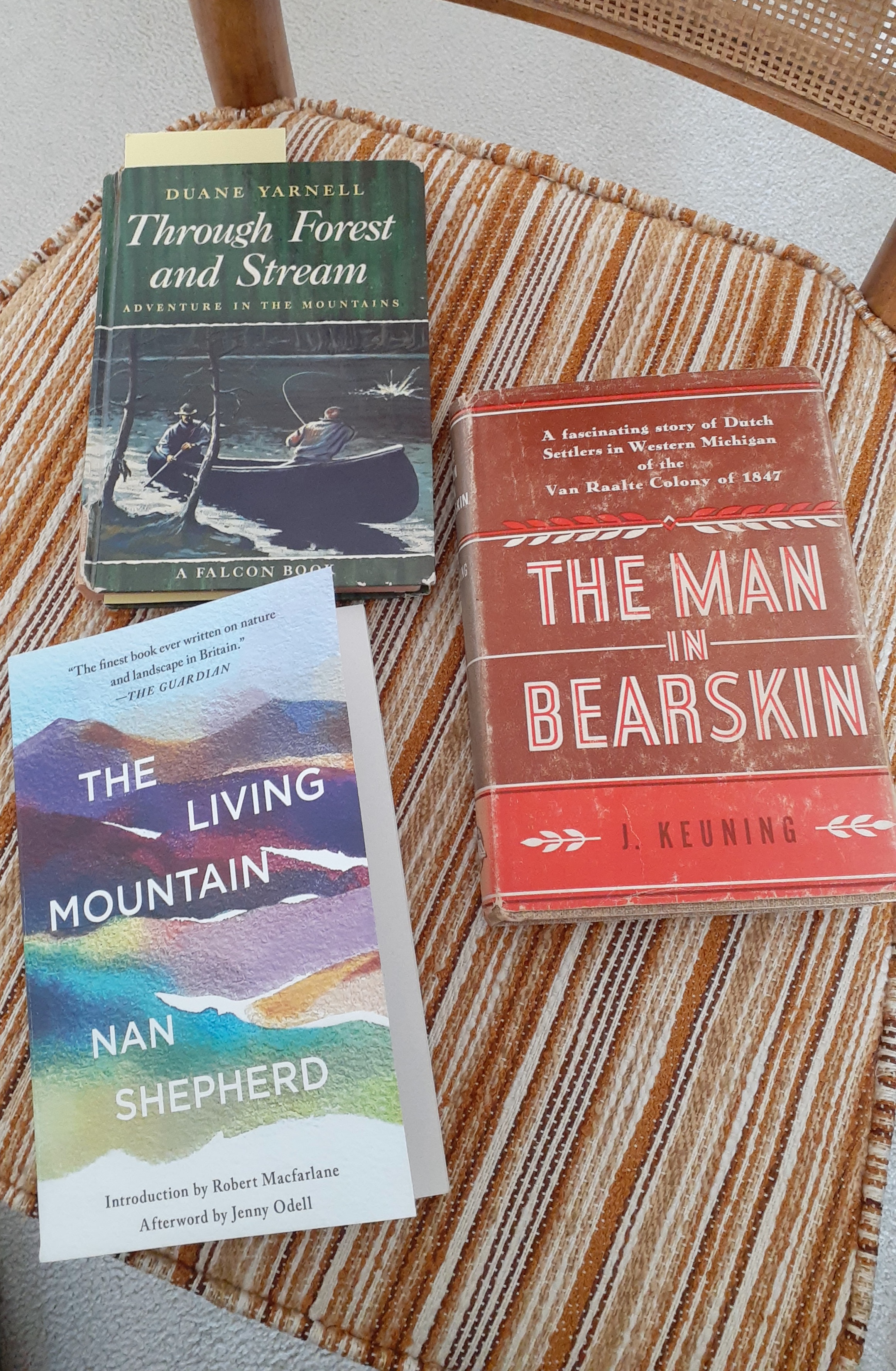 My other recent readings include Christmas gift books from the 1950s. Grandfather Christian gave books to each of the grandchildren, plus a dollar. Right now, I’ve read Through Forest and Stream, Adventure In the Mountain, by Duane Yarnell (The World Publishing Company, Cleveland and New York, 1949). I’m learned something about my 10-year-old self as I moved through yellowed pages. The same is true for my 12-year-old self-revealed in the book, The Man in Bearskin, by J. Keuning (Wm B. Erdmans Grand Rapids, 1954).